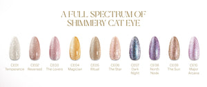 ✨ Flash Glitter, 🌙Pearlescent, 💫 Velvet Cat Eye, et 🐈 Shimmer Cat Eye.
