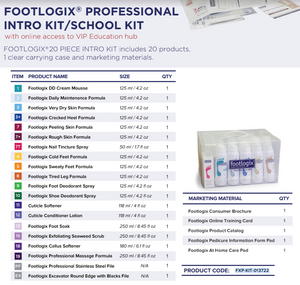 Livraison RapideReçois Ton Colis En 2-3 Jours OuvrablesStart delivering incredible results with the FOOTLOGIX PROFESSIONAL 16-Piece Student Intro Kit! This essential kit offers the Footlogix line of "medical pedicure" products for effective, transformative results for your clients' dry, callused and cracked skin. Includes formulas for daily care, dry feet, cracked heels, fuzzy skin, rough skin, cold feet and sweating.