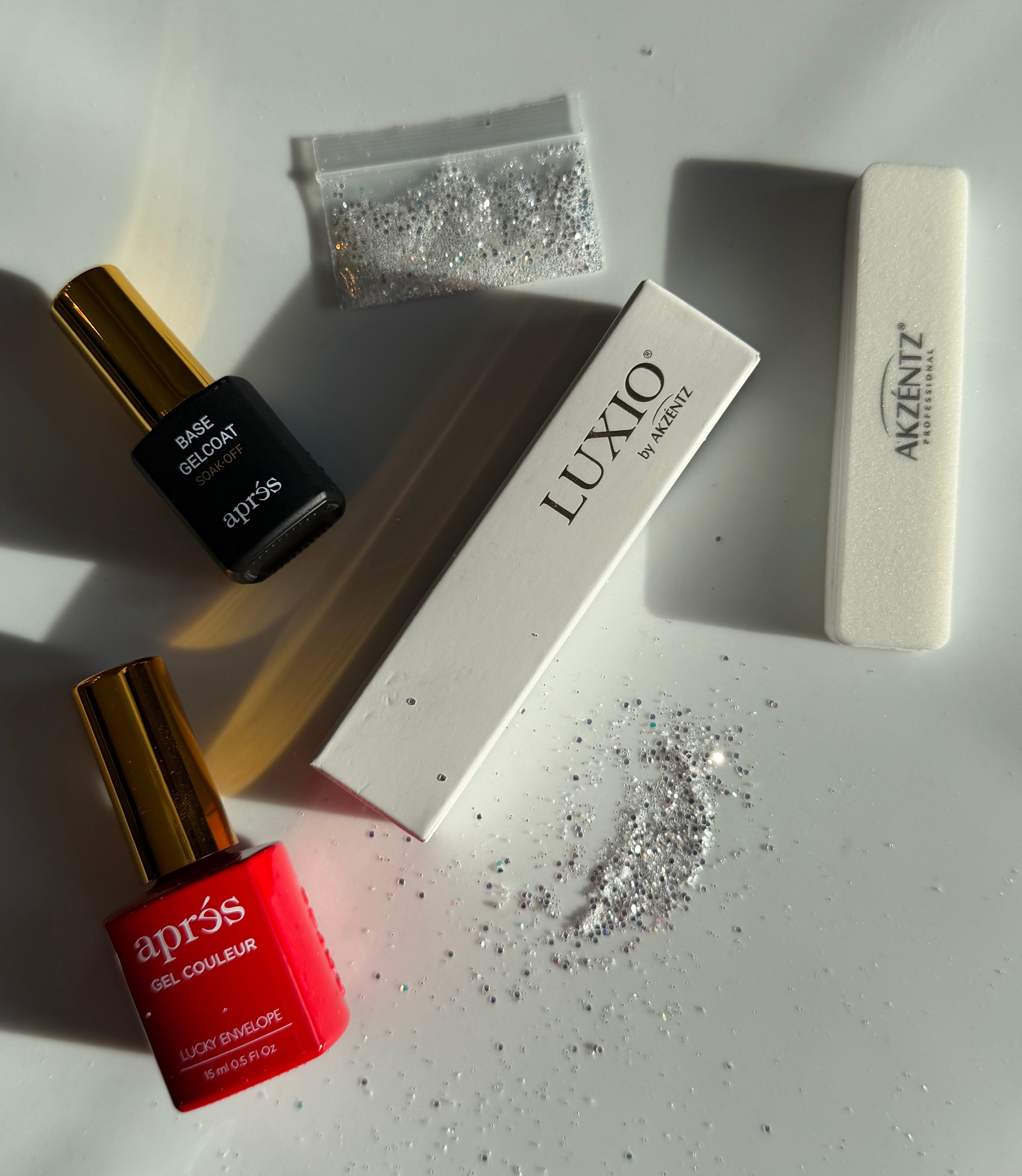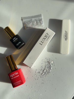 Cet ensemble complet comprend la Base Gelcoat Soak Off 5 ml d’Après, le vernis Lucky Envelope d’Aprés Nail, l’huile pour ongles et cuticules 7,5 ml d’Akzentz, un mini lime éponge extra fine Akzentz pour une surface ultra lisse et application parfaite, ainsi qu’un sachet de brillants Nailify pour ajouter une touche d’éclat.