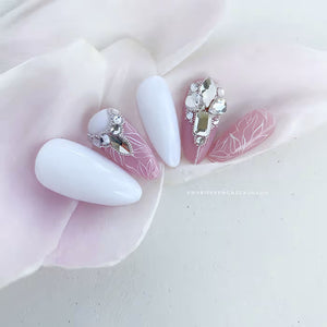 Application Marie-Ève Mongeau method: Apply a little resin medium to the nail on the targeted area. Using a wax tip, take the jewel and place it on the resin. Do not catalyze, the resin dries slowly enough to allow you to place the jewel, and fast enough not to have to catalyze.